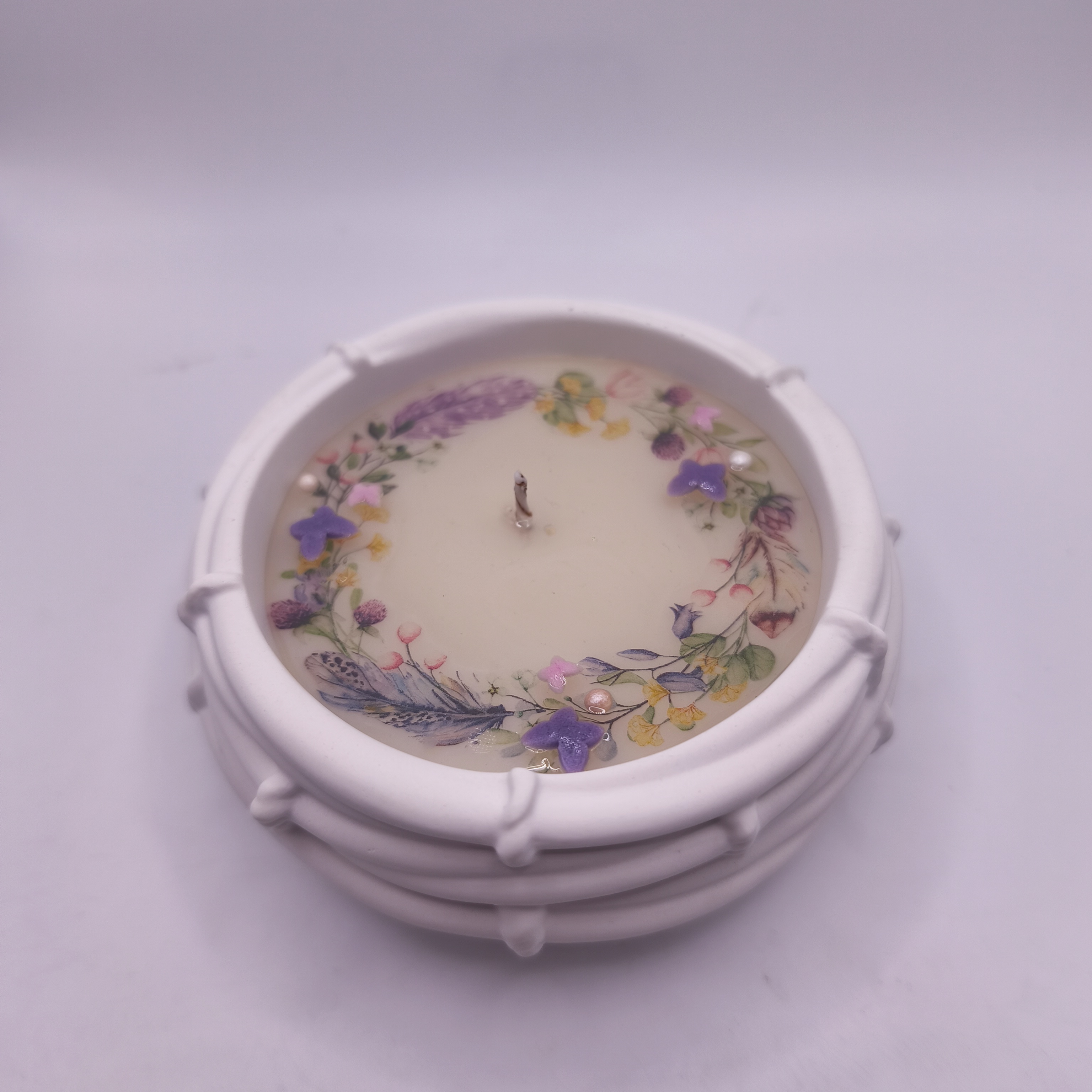 Beim Abbrennen schmilzt das Wachs im Inneren gleichmäßig, während am äußeren Rand ein filigraner Rest bestehen bleibt. Dadurch bleibt der wunderschöne Blütenkranz dauerhaft erhalten und sorgt auch nach dem Abbrennen für ein dekoratives Arrangement.