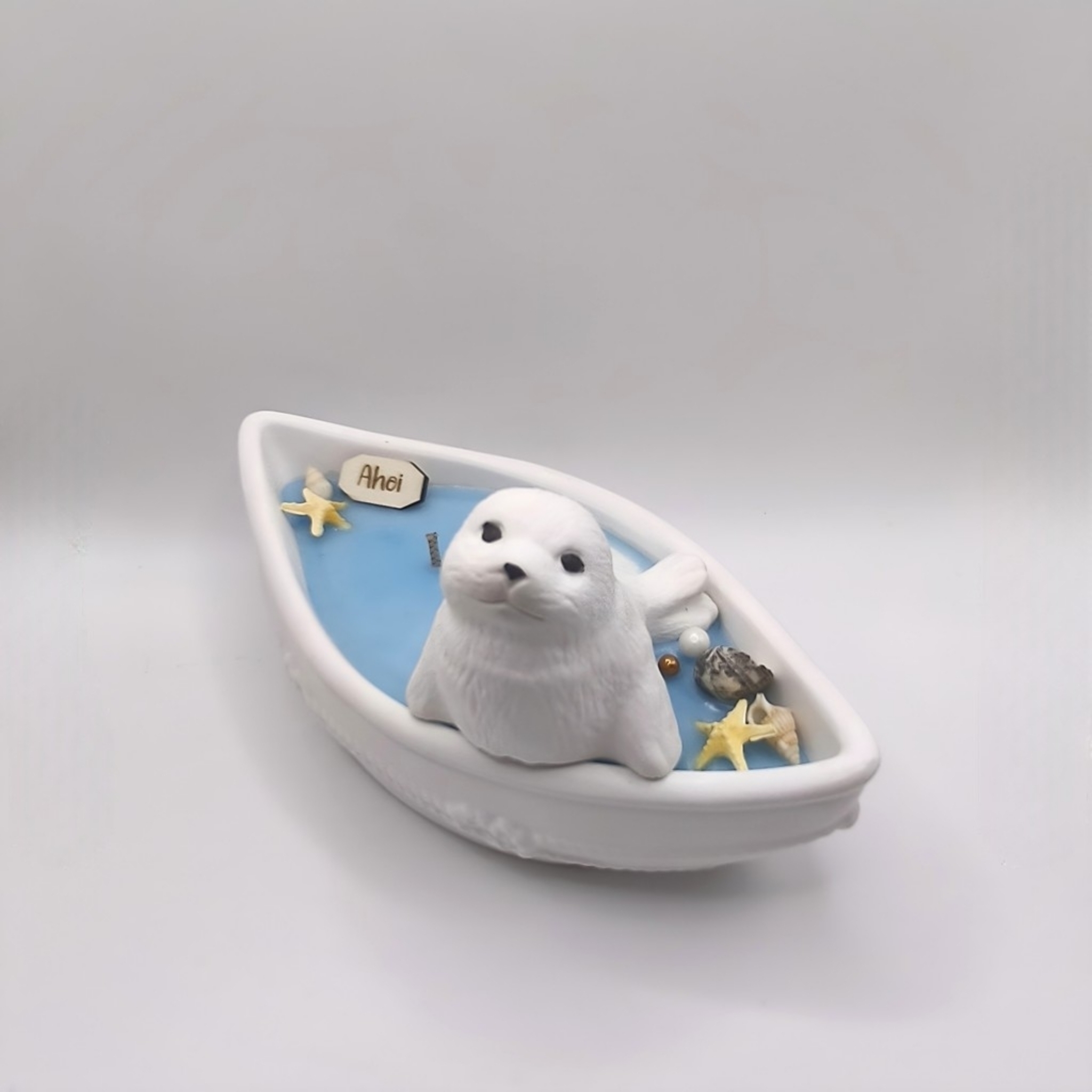 Eine kleine Robbe wacht über das Boot, umgeben von zarten Muscheln, Perlenpunkten und selbstgemachten Seesternchen, die jedes Stück zu einem echten Unikat machen. Abgerundet wird das Design durch ein kleines Holzlabel mit der Aufschrift „ahoi“, das den maritimen Charakter perfekt unterstreicht.
