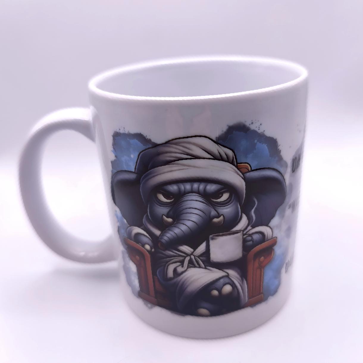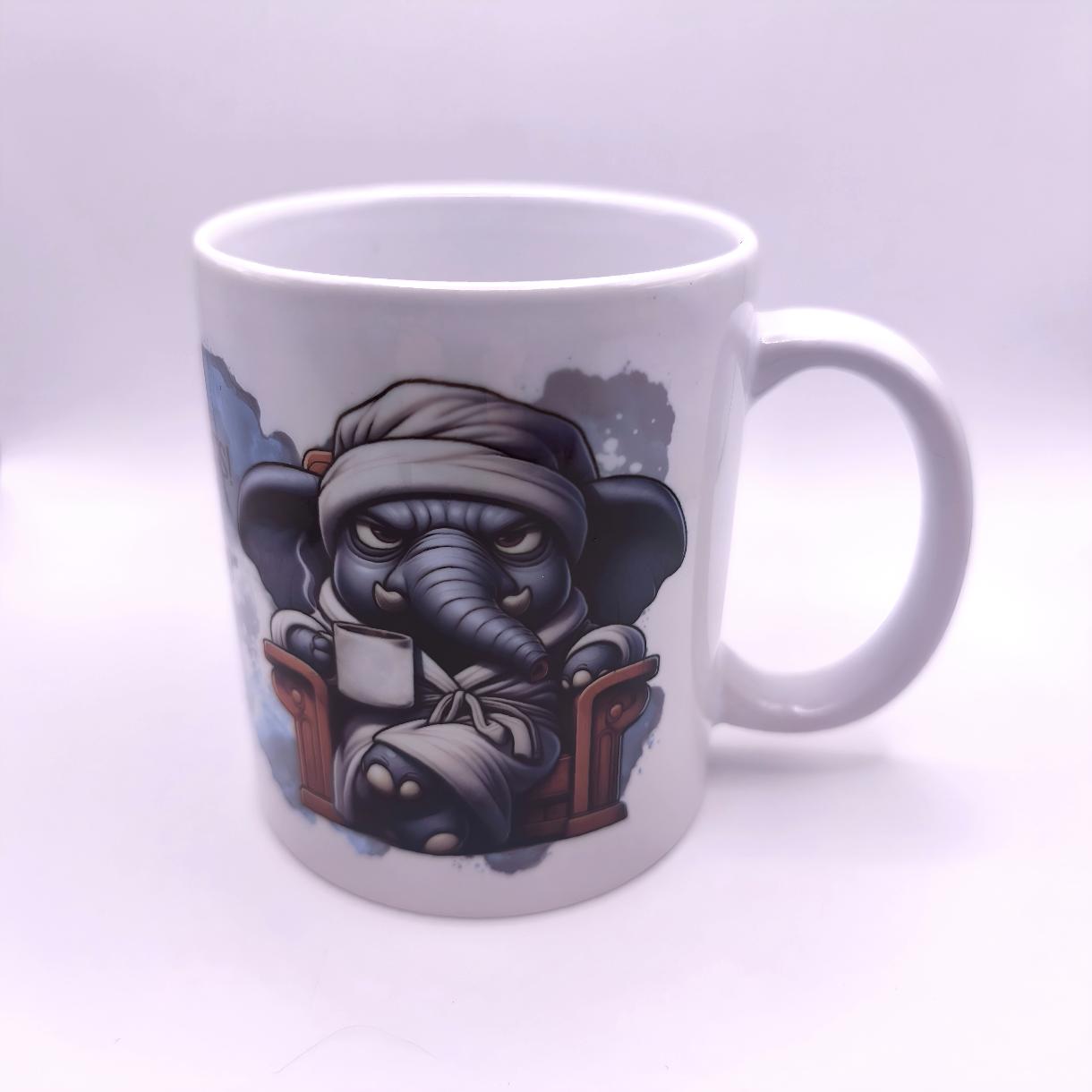 Diese originelle Tasse im humorvollen Aquarell-Design sorgt garantiert für Lacher und gute Laune. Auf beiden Seiten der Tasse ist ein grimmig dreinblickender Elefant im Bademantel dargestellt, der auf einem braunen Stuhl sitzt. Die witzige Szene wirkt zugleich niedlich und herrlich ironisch und macht die Tasse zu einem echten Hingucker. Das liebevoll gestaltete Motiv ist im Aquarell-Stil gehalten und unterstreicht den besonderen Charakter dieser außergewöhnlichen Tasse. In der Mitte der Tasse steht der humorvolle Spruch: