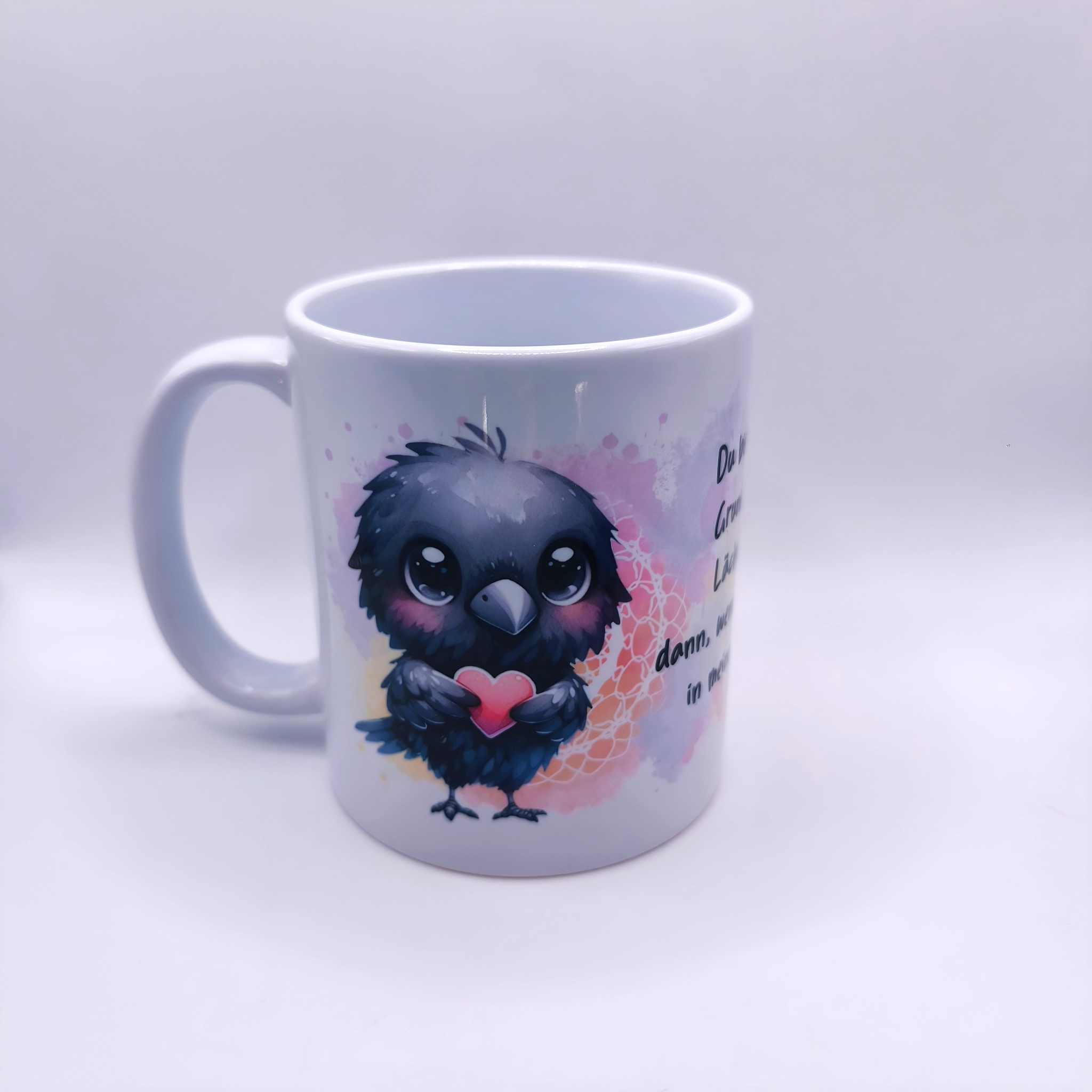 Diese wunderschöne Tasse im detailreichen Aquarell-Design vereint Zartheit, Symbolik und Herzenswärme. Zwei besonders niedliche Krähen halten gemeinsam ein Herz und sind liebevoll gestaltet. Die Motive befinden sich auf beiden Seiten der Tasse und fügen sich harmonisch in den sanften Aquarell-Hintergrund ein. Zarte Rosa-, Gelb- und Orangetöne werden durch filigrane Mandala-Elemente ergänzt und verleihen der Tasse eine besondere Tiefe und eine ruhige, warme Ausstrahlung. In der Mitte der Tasse steht der emotionale Spruch: