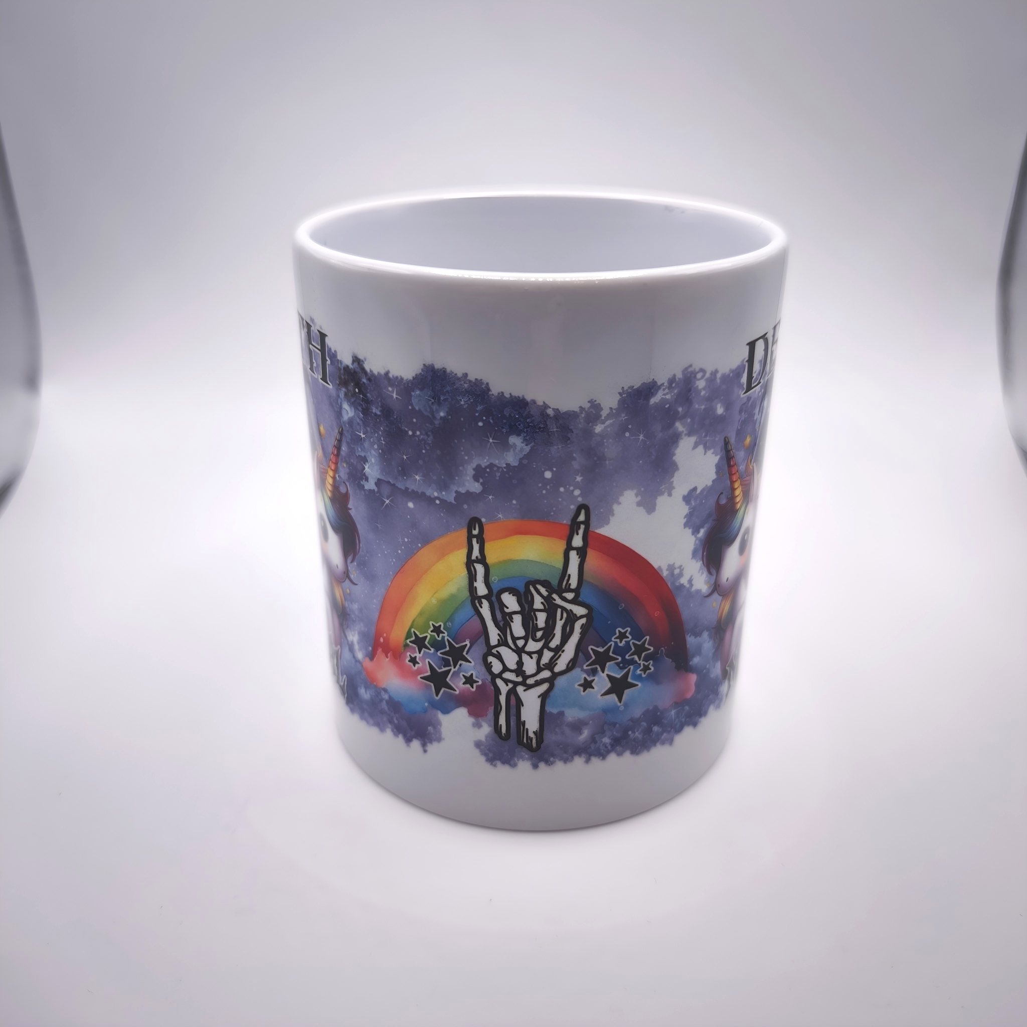 Diese außergewöhnliche Tasse kombiniert düstere Metal-Vibes mit einer guten Portion Humor. Ein grimmiger Reaper reitet auf einem Einhorn, begleitet von einem leuchtenden Regenbogen und dem ikonischen Skelett-Handzeichen für Metal. Der dunkle Aquarell-Hintergrund setzt das Motiv perfekt in Szene und macht die Tasse zu einem echten Blickfang.