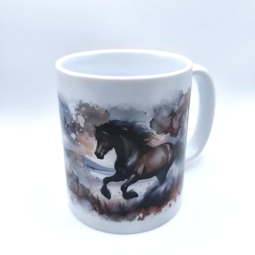 Diese ausdrucksstarke Tasse im beeindruckenden Aquarell-Design fängt die Kraft, Freiheit und Eleganz eines braunen Pferdes (Hengst) auf besondere Weise ein. Das Motiv zeigt einen majestätischen Hengst vor einer stimmungsvollen, leicht stürmischen Landschaft. Die harmonisch abgestimmten Blau- und Grautöne verleihen der Szene eine intensive Tiefe und eine ruhige, zugleich kraftvolle Ausstrahlung. Das Gesamtbild wirkt lebendig, emotional und naturverbunden.
