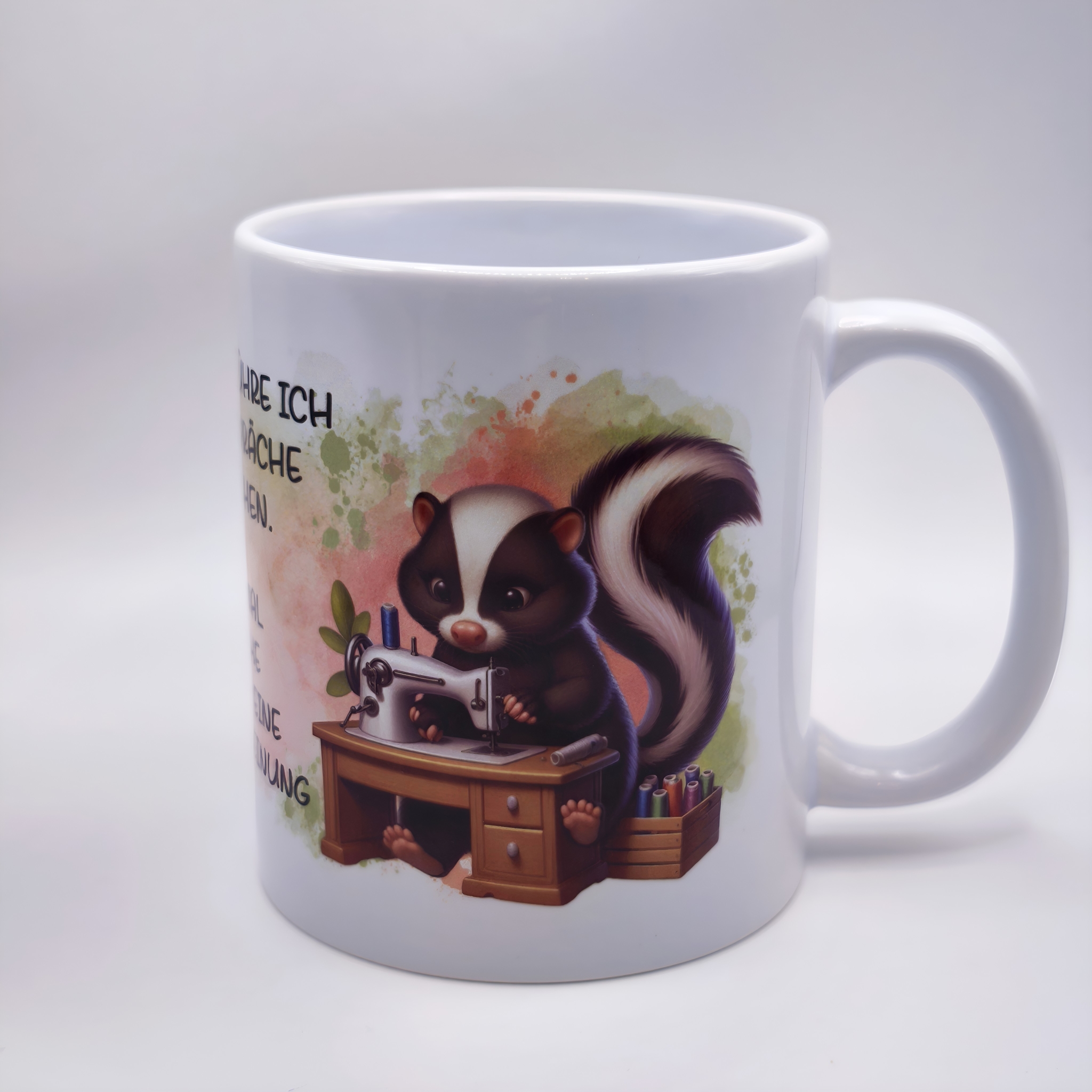 Das niedliche Stinktier, das konzentriert an der Nähmaschine sitzt, ist im zarten Aquarellstil gehalten. Der Hintergrund in sanften Rosa- und Hellgrüntönen verleiht der Tasse eine fröhliche, kreative Ausstrahlung. Ideal für den Kaffee oder Tee während der nächsten Nähpause.