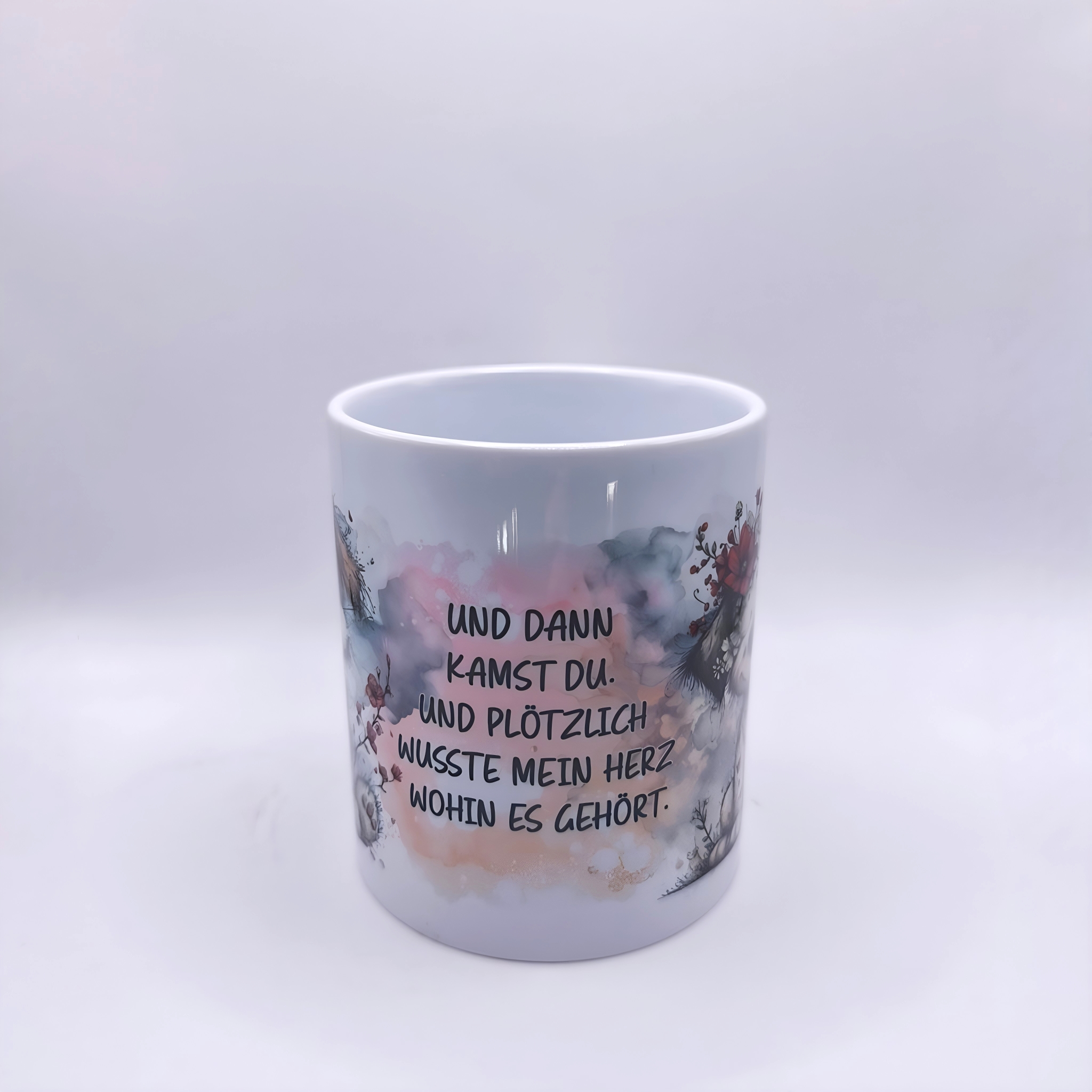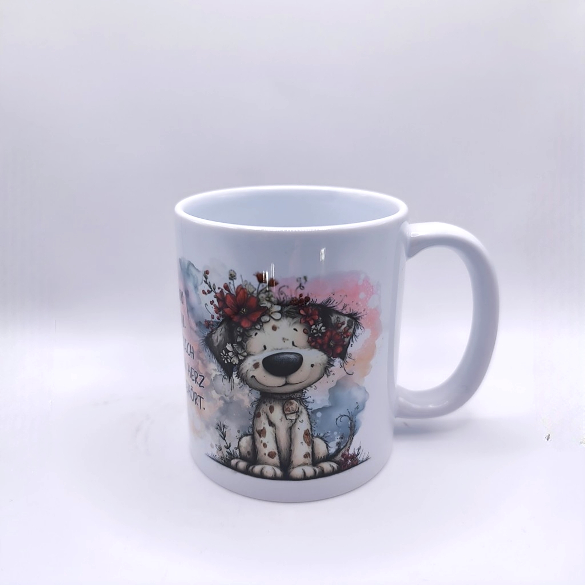 Diese liebevoll gestaltete Tasse mit Hunde-Motiv bringt Wärme, Gefühl und eine besondere Botschaft in deinen Alltag. Zwei unterschiedliche, süße Hunde sind in einem harmonischen Aquarell-Design dargestellt. Der sanfte Farbverlauf in Grau-, Beige- und Rosatönen verleiht der Tasse eine ruhige, elegante Ausstrahlung. Abgerundet wird das Motiv durch den emotionalen Spruch: