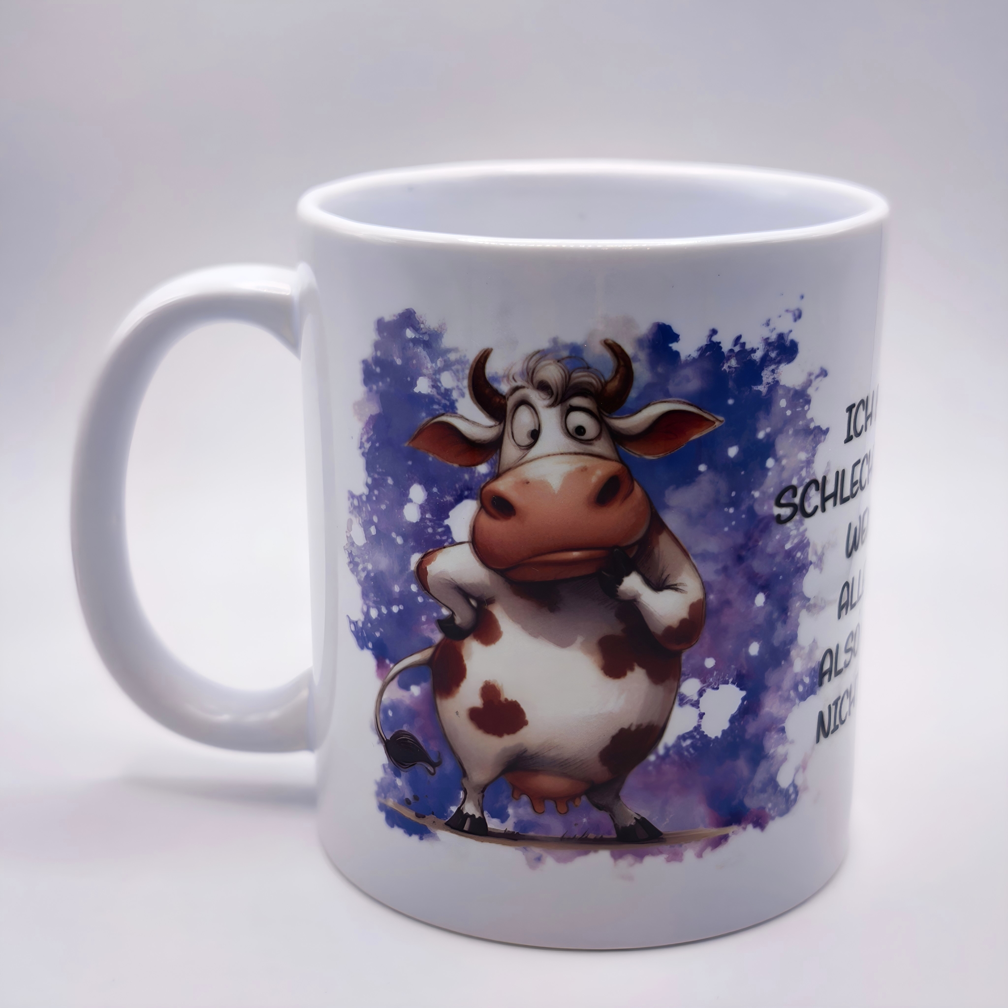 Das liebevoll gestaltete Kuhmotiv vor einem sanften Blau-Lila-Hintergrund ist im Aquarellstil gehalten und verleiht der Tasse eine fröhliche, moderne Ausstrahlung. Perfekt für den Start in den Tag oder eine kleine Auszeit zwischendurch – mit dieser Tasse schmeckt Kaffee, Tee oder Kakao gleich doppelt so gut.